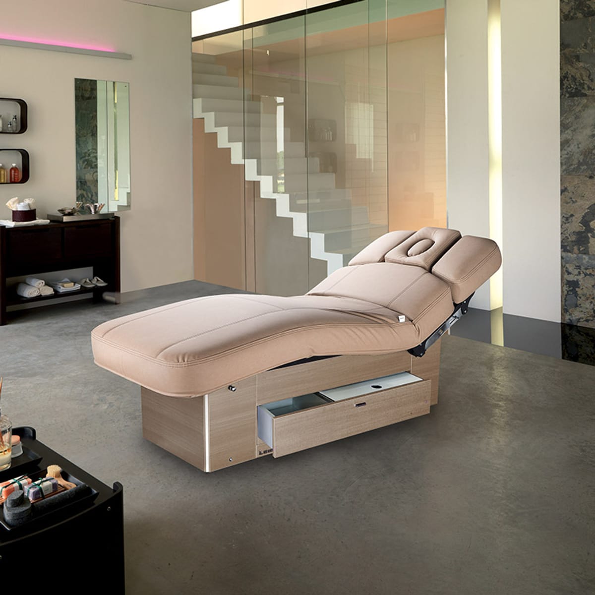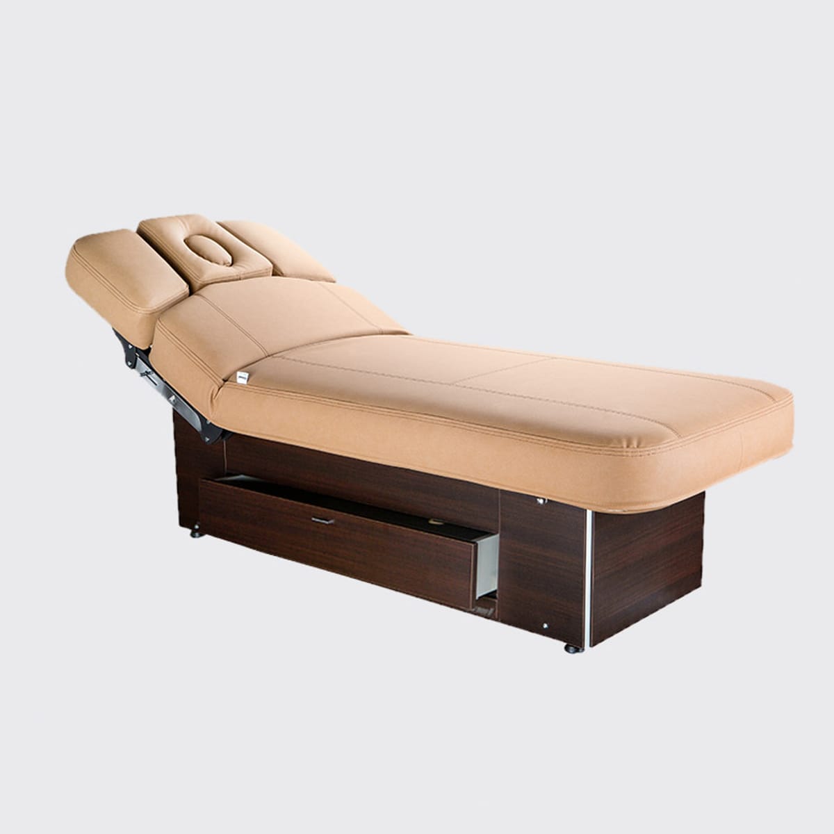 Масата е оборудвана с удобно и голямо дървено чекмедже, което може да се издърпа с помощта на малка дръжка. Чекмеджето е разработено с безшумно бавно затваряне, за максимална ергономичност на практикуващия и тишина за клиента.