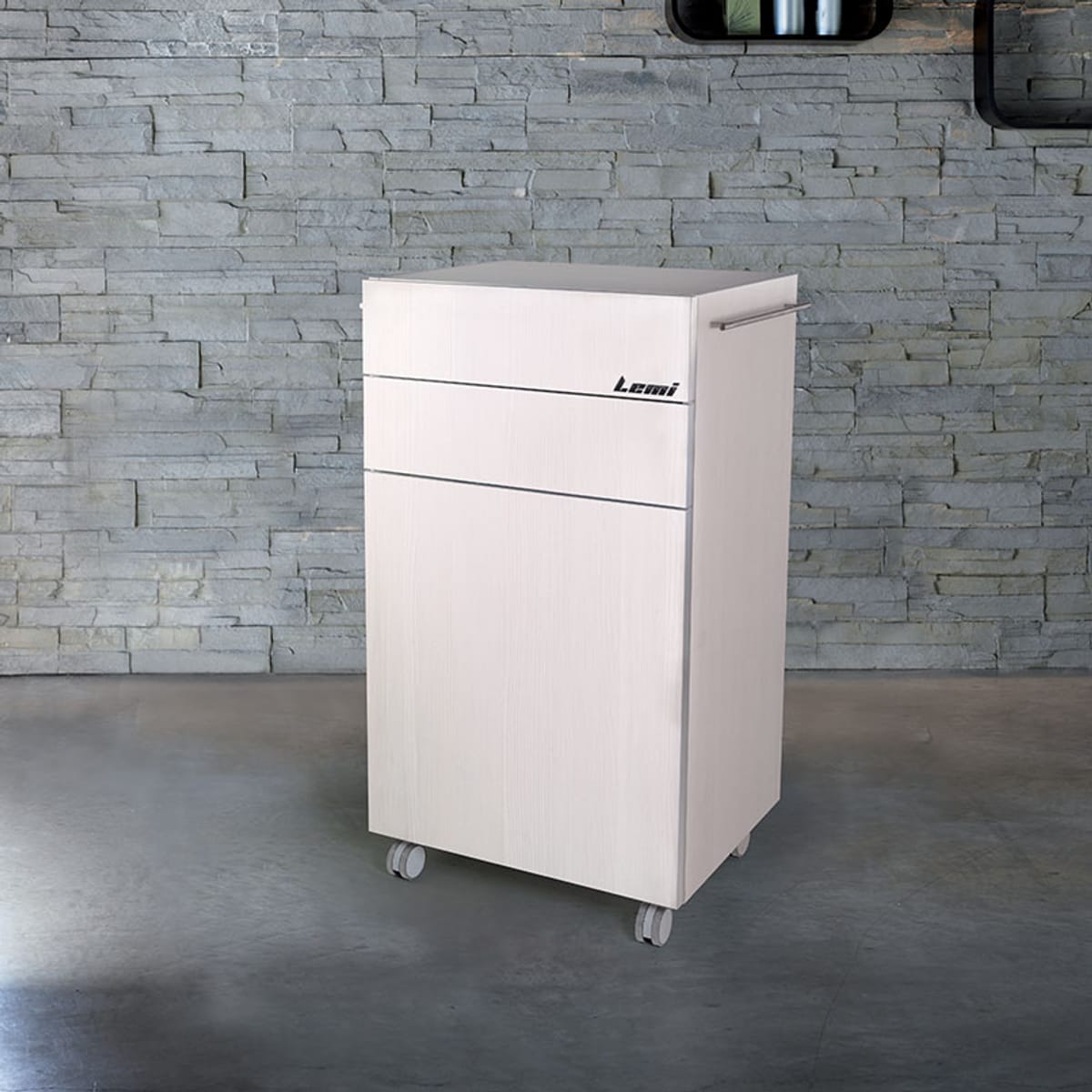 Компактна многофункционална количка Т ONE, оборудвана с две чекмеджета и единичен шкаф с рафт.